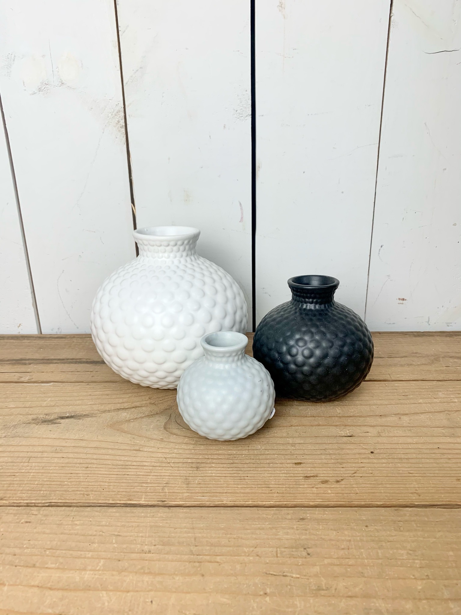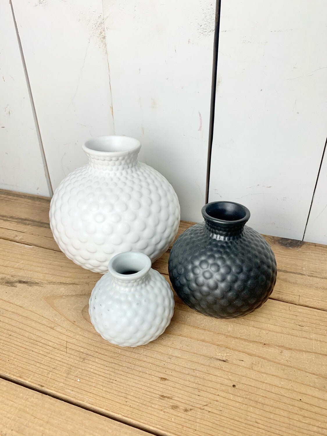 In colors ranging from white, to gray, to black, this trio of decorative vases really stand out on a tabletop or shelf. Sold individually.